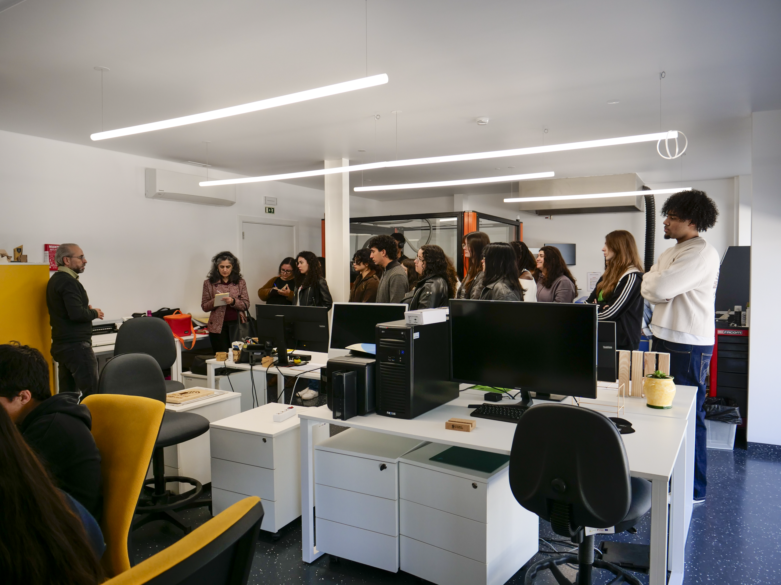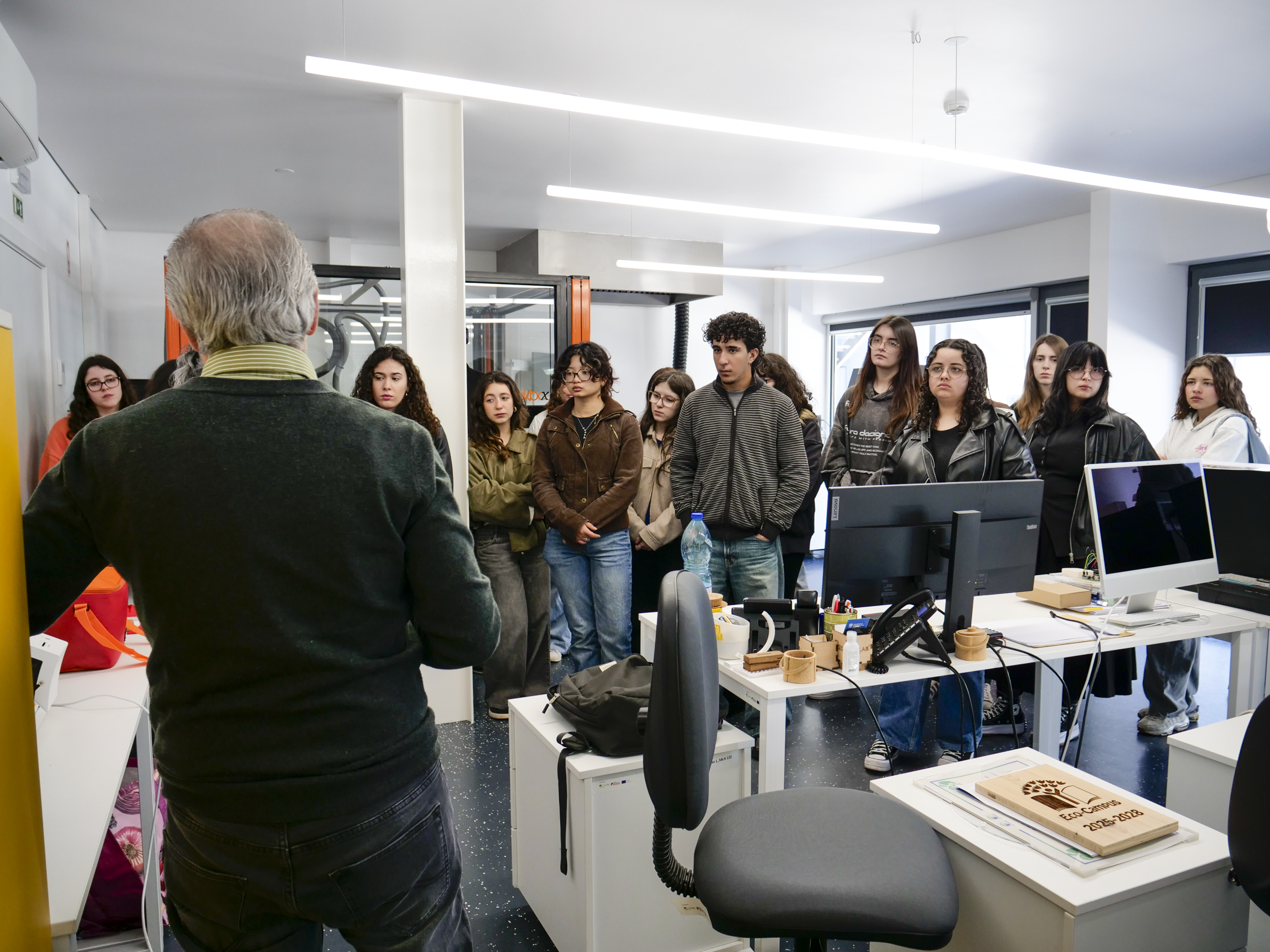Durante a visita, os alunos tiveram a oportunidade de explorar as potencialidades do FabLab e compreender de que forma estas tecnologias podem ser integradas nos processos de design, assim como as diversas ferramentas utilizadas no desenvolvimento de projetos criativos, desde a conceção até à materialização de ideias.